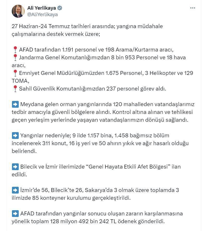 ANKARA, (DHA)- İÇİŞLERİ Bakanı Ali Yerlikaya, "Bilecik ve İzmir illerimiz 'Genel Hayata Etkili Afet Bölgesi' ilan edildi. İzmir'de 56, Bilecik'te 26, Sakarya'da 3 olmak üzere toplamda 3 ilimizde 85 konteyner kurulumu gerçekleştirildi. AFAD tarafından yangınlar sonucu oluşan zararın karşılanmasına yönelik toplam 128 milyon 492 bin 242 TL ödenek gönderildi" dedi.