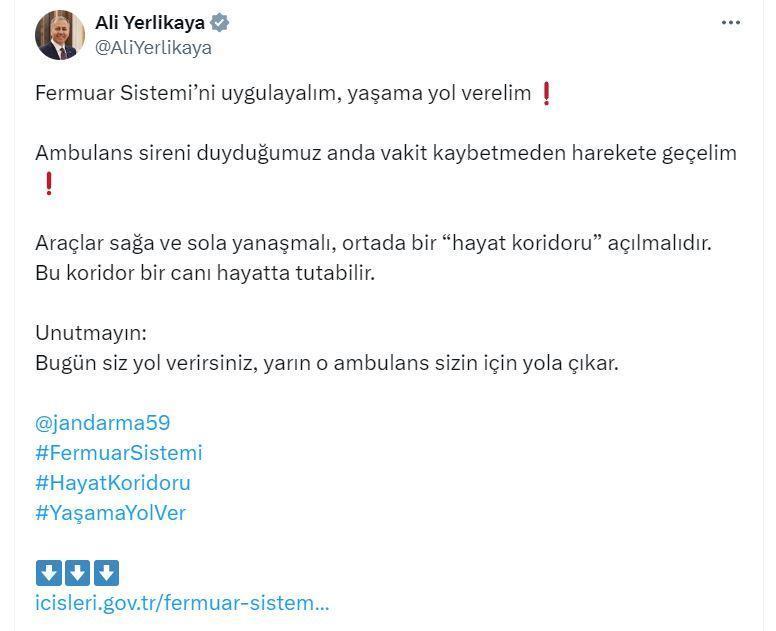 ANKARA, (DHA)- İÇİŞLERİ Bakanı Ali Yerlikaya, "Fermuar sistemini uygulayalım, yaşama yol verelim. Ambulans sireni duyduğumuz anda vakit kaybetmeden harekete geçelim" dedi.