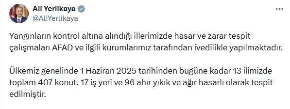 İçişleri Bakanı Ali Yerlikaya, sosyal medya hesabından yaptığı açıklamada, "Yangınların kontrol altına alındığı illerimizde hasar ve zarar tespit çalışmaları AFAD ve ilgili kurumlarımız tarafından ivedilikle yapılmaktadır. Ülkemiz genelinde 1 Haziran 2025 tarihinden bugüne kadar 13 ilimizde toplam 407 konut, 17 iş yeri ve 96 ahır yıkık ve ağır hasarlı olarak tespit edilmiştir" ifadelerini kullandı.