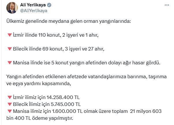 İçişleri Bakanı Ali Yerlikaya, sosyal medya hesabından yaptığı açıklamada, "Ülkemiz genelinde meydana gelen orman yangınlarında; İzmir ilinde 110 konut, 2 iş yeri ve 1 ahır, Bilecik ilinde 69 konut, 3 iş yeri ve 27 ahır, Manisa ilinde ise 5 konut yangın afetinden dolayı ağır hasar gördü. Yangın afetinden etkilenen afetzede vatandaşlarımıza barınma, taşınma ve eşya yardımı kapsamında, İzmir ilimiz için 14 milyon 258 bin 400 TL, Bilecik ilimiz için 5 milyon 745 bin TL, Manisa ilimiz için 1 milyon 600 bin TL olmak üzere toplam 21 milyon 603 bin 400 TL ödeme yapılmıştır" dedi.