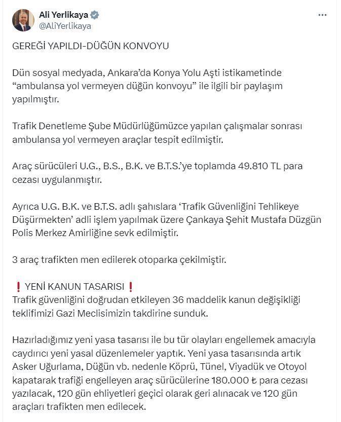 Bakan Yerlikaya, sosyal medya hesabından yaptığı açıklamada, dün sosyal medyada, Ankara'da 'ambulansa yol vermeyen düğün konvoyu' ile ilgili bir paylaşım yapıldığını ifade etti. Trafik Denetleme Şube Müdürlüğü tarafından yapılan çalışmalar sonrası ambulansa yol vermeyen araçların tespit edildiğini belirten Yerlikaya, "Araç sürücüleri U.G., B.S., B.K. ve B.T.S.'ye toplamda 49 bin 810 TL para cezası uygulanmıştır. Ayrıca U.G., B.K. ve B.T.S. adlı şahıslara 'Trafik Güvenliğini Tehlikeye Düşürmekten' adli işlem yapılmak üzere Çankaya Şehit Mustafa Düzgün Polis Merkez Amirliğine sevk edilmiştir. 3 araç trafikten menedilerek otoparka çekilmiştir" dedi.