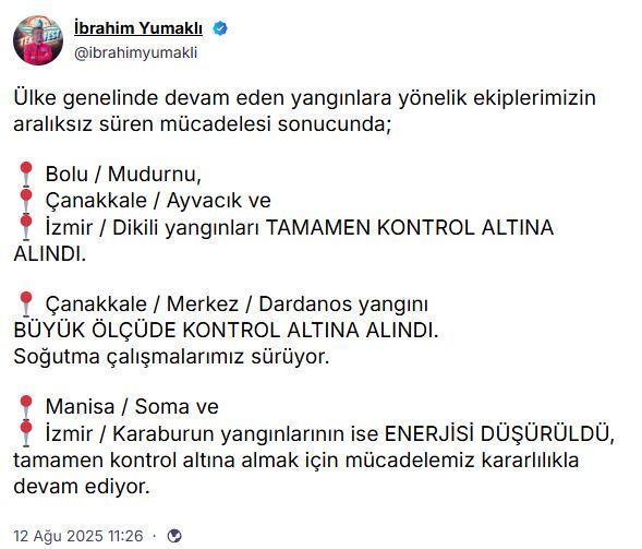 Tarım ve Orman Bakanı İbrahim Yumaklı, sosyal medya hesabından yaptığı açıklamada, "Ülke genelinde devam eden yangınlara yönelik ekiplerimizin aralıksız süren mücadelesi sonucunda Bolu Mudurnu, Çanakkale Ayvacık ve İzmir Dikili yangınları tamamen kontrol altına alındı. Çanakkale merkez ve Dardanos yangını büyük ölçüde kontrol altına alındı. Soğutma çalışmalarımız sürüyor. Manisa Soma ve İzmir Karaburun yangınlarının ise enerjisi düşürüldü, tamamen kontrol altına almak için mücadelemiz kararlılıkla devam ediyor" dedi. (DHA)