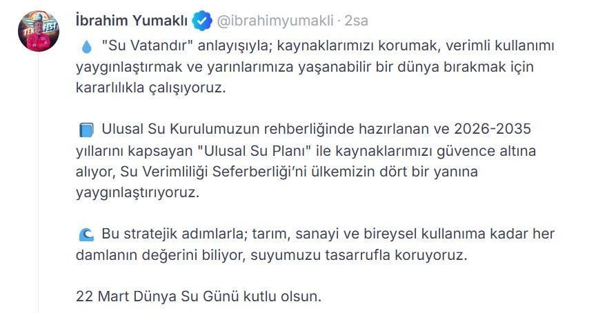 Bakan Yumaklı, 22 Mart Dünya Su Günü kapsamında sanal medya hesabından paylaştığı mesajda, "'Su Vatandır' anlayışıyla; kaynaklarımızı korumak, verimli kullanımı yaygınlaştırmak ve yarınlarımıza yaşanabilir bir dünya bırakmak için kararlılıkla çalışıyoruz. Ulusal Su Kurulumuzun rehberliğinde hazırlanan ve 2026-2035 yıllarını kapsayan 'Ulusal Su Planı' ile kaynaklarımızı güvence altına alıyor, Su Verimliliği Seferberliği’ni ülkemizin dört bir yanına yaygınlaştırıyoruz. Bu stratejik adımlarla; tarım, sanayi ve bireysel kullanıma kadar her damlanın değerini biliyor, suyumuzu tasarrufla koruyoruz. 22 Mart Dünya Su Günü kutlu olsun" ifadelerini kullandı. (DHA)