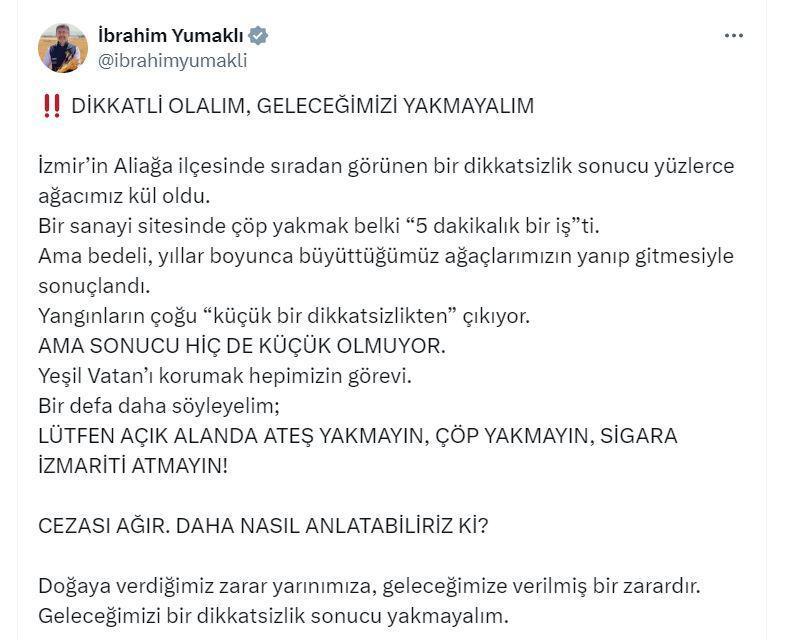 ANKARA, (DHA)- TARIM ve Orman Bakanı İbrahim Yumaklı, İzmir'in Aliağa ilçesinde dikkatsizlik sonucu çıkan yangında yüzlerce ağacın kül olduğunu belirterek, "Lütfen açık alanda ateş yakmayın, çöp yakmayın, sigara izmariti atmayın. Cezası ağır. Daha nasıl anlatabiliriz ki? Doğaya verdiğimiz zarar yarınımıza, geleceğimize verilmiş bir zarardır" dedi.