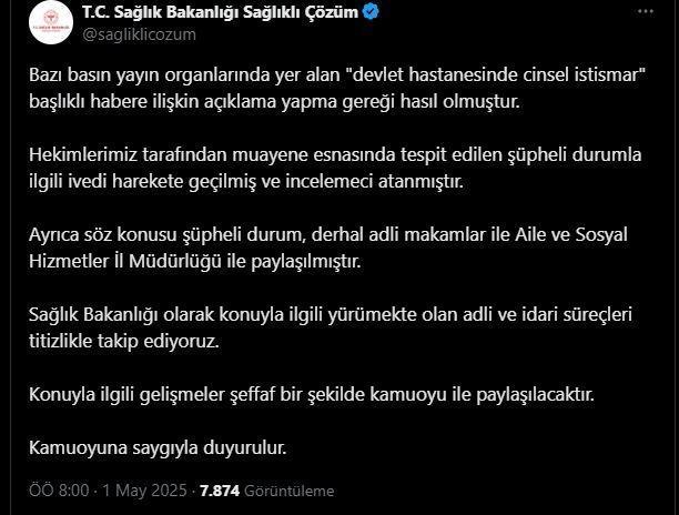 Sağlık Bakanlığı'nın 'Sağlıklı Çözüm' sosyal medya hesabından yapılan açıklamada, "Bazı basın yayın organlarında yer alan 'devlet hastanesinde cinsel istismar' başlıklı habere ilişkin açıklama yapma gereği hasıl olmuştur. Hekimlerimiz tarafından muayene esnasında tespit edilen şüpheli durumla ilgili ivedi harekete geçilmiş ve incelemeci atanmıştır. Ayrıca söz konusu şüpheli durum, derhal adli makamlar ile Aile ve Sosyal Hizmetler İl Müdürlüğü ile paylaşılmıştır. Sağlık Bakanlığı olarak konuyla ilgili yürümekte olan adli ve idari süreçleri titizlikle takip ediyoruz. Konuyla ilgili gelişmeler şeffaf bir şekilde kamuoyu ile paylaşılacaktır" ifadeleri kullandı. (DHA)