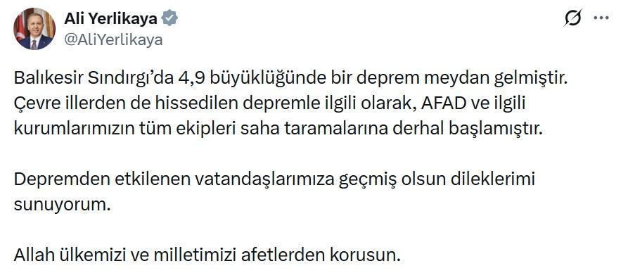 İçişleri Bakanı Ali Yerlikaya, sosyal medya hesabından yaptığı açıklamada, "Balıkesir Sındırgı’da 4,9 büyüklüğünde bir deprem meydan gelmiştir. Çevre illerden de hissedilen depremle ilgili olarak, AFAD ve ilgili kurumlarımızın tüm ekipleri saha taramalarına derhal başlamıştır. Depremden etkilenen vatandaşlarımıza geçmiş olsun dileklerimi sunuyorum. Allah ülkemizi ve milletimizi afetlerden korusun" dedi.