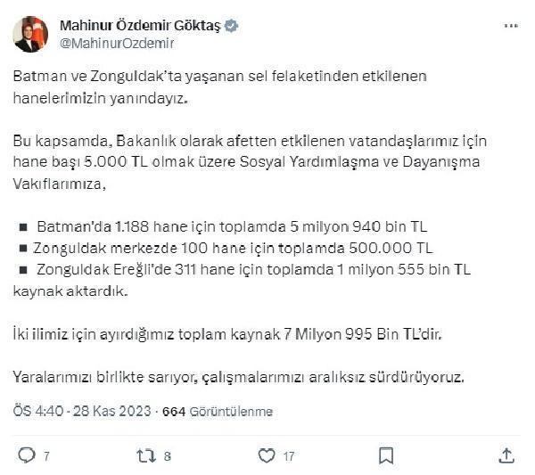 Aile ve Sosyal Hizmetler Bakanı Mahinur Özdemir Göktaş, sosyal medya hesabından yaptığı açıklamada, Batman ve Zonguldak'ta yaşanan sel felaketinden etkilenenlerin yanlarında olduklarını belirterek, "Bu kapsamda, Bakanlık olarak afetten etkilenen vatandaşlarımız için hane başı 5 bin TL olmak üzere Sosyal Yardımlaşma ve Dayanışma Vakıflarımıza, Batman'da 1188 hane için toplamda 5 milyon 940 bin TL, Zonguldak merkezde 100 hane için toplamda 500 bin TL, Zonguldak Ereğli'de 311 hane için toplamda 1 milyon 555 bin TL kaynak aktardık. İki ilimiz için ayırdığımız toplam kaynak 7 milyon 995 bin TL'dir. Yaralarımızı birlikte sarıyor, çalışmalarımızı aralıksız sürdürüyoruz" ifadelerini kullandı. (DHA)