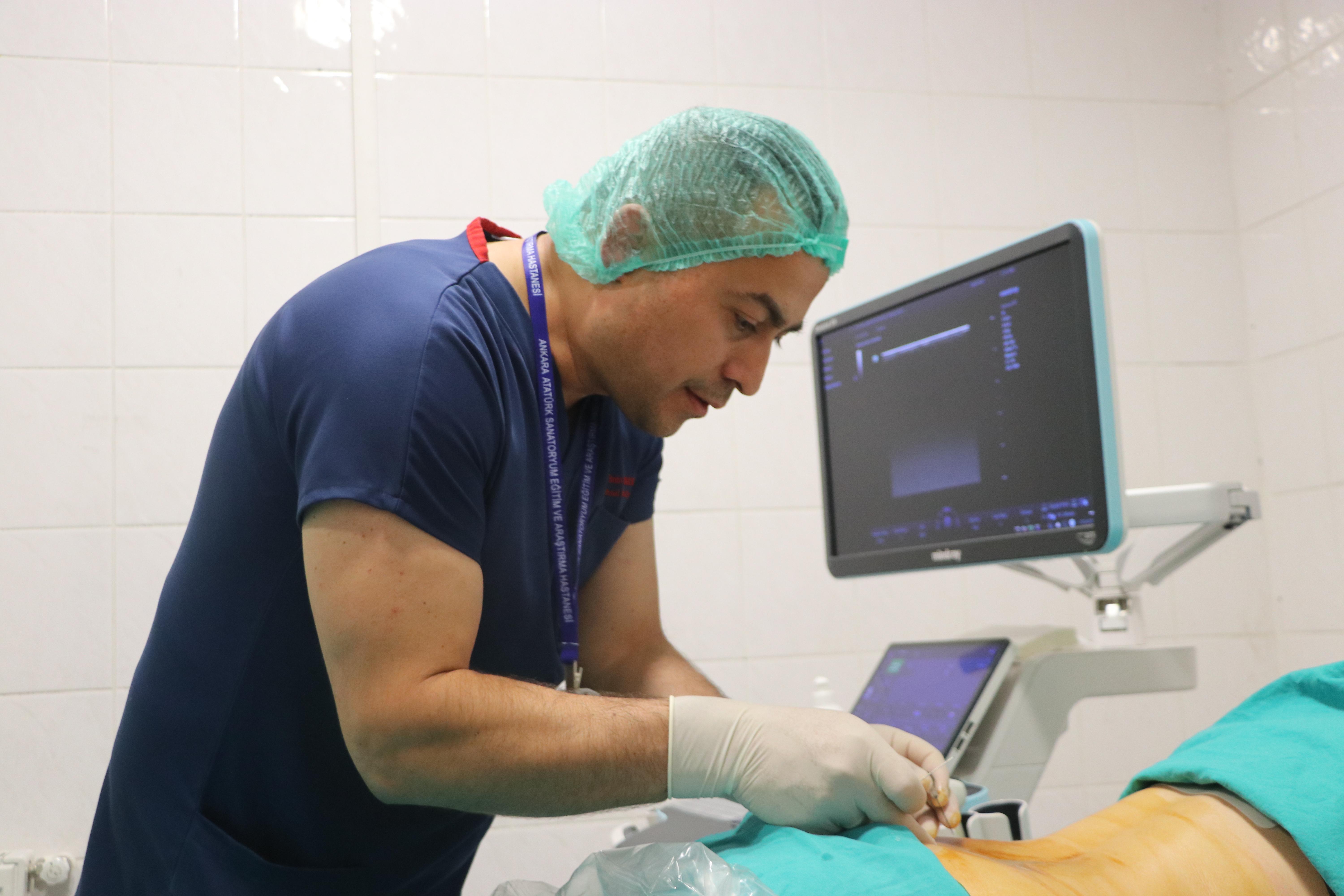 Ankara Atatürk Sanatoryum Eğitim ve Araştırma Hastanesi'nde bel ve boyun fıtığının yanında vücuttaki tüm ağrılar için radyofrekans tedavisi uygulanabiliyor. 3 yıldır şiddetli bel ağrısı çeken hemşire Sevim Pekdoğan'da bel fıtığı başlangıcı, bel omurlarında yapışma ve bazı eklemlerinde ödem tespit edildi. Hemşire Pekdoğan'a radyofrekans dalgası tedavisi gerçekleştirildi. Pekdoğan, uygulanan tedaviyle sağlığına kavuştu. Operasyonu gerçekleştiren Doç. Dr. Emin Çakmakçı, "Ultrason eşliğinde öncelikle ağrının sebebi bulunuyor. Ağrı vücudun hangi bölgesindeyse o bölgeye lokal anestezi yapılıyor. Lokal anesteziden sonra, radyo frekans enerjisi veren bir cihaza vücudun o bölgesini bağlıyoruz. Yaklaşık 1,5 dakika boyunca ilgili bölgeye 80 derecede ısıtılmış radyo frekans dalgası veriliyor. Genelde tek bir ya da iki uygulama ile hasta sağlığına kavuşuyor" dedi.
