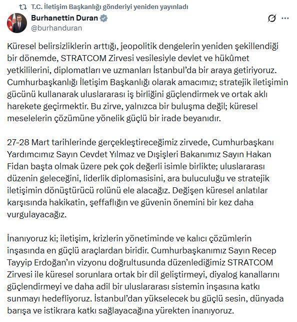 İletişim Başkanı Duran, sanal medya hesabından yaptığı açıklamada, "Küresel belirsizliklerin arttığı, jeopolitik dengelerin yeniden şekillendiği bir dönemde, STRATCOM Zirvesi vesilesiyle devlet ve hükümet yetkililerini, diplomatları ve uzmanları İstanbul’da bir araya getiriyoruz. Cumhurbaşkanlığı İletişim Başkanlığı olarak amacımız; stratejik iletişimin gücünü kullanarak uluslararası iş birliğini güçlendirmek ve ortak aklı harekete geçirmektir. Bu zirve, yalnızca bir buluşma değil; küresel meselelerin çözümüne yönelik güçlü bir irade beyanıdır. 27-28 Mart tarihlerinde gerçekleştireceğimiz zirvede, Cumhurbaşkanı Yardımcımız Sayın Cevdet Yılmaz ve Dışişleri Bakanımız Sayın Hakan Fidan başta olmak üzere pek çok değerli isimle birlikte; uluslararası düzenin geleceğini, liderlik diplomasisini, ara buluculuğu ve stratejik iletişimin dönüştürücü rolünü ele alacağız. Değişen küresel anlatılar karşısında hakikatin, şeffaflığın ve güvenin önemini bir kez daha vurgulayacağız" ifadelerini kullandı.