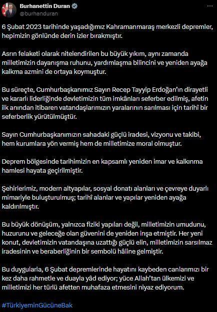 Cumhurbaşkanı Recep Tayyip Erdoğan’ın sahadaki güçlü iradesi, vizyonu ve takibinin, kurumlara yön verdiğini ve millete moral olduğunu belirten Duran, "Deprem bölgesinde tarihimizin en kapsamlı yeniden imar ve kalkınma hamlesi hayata geçirilmiştir. Şehirlerimiz, modern altyapılar, sosyal donatı alanları ve çevreye duyarlı mimariyle buluşturulmuş; tarihi alanlar ve yapılar yeniden ayağa kaldırılmıştır. Bu büyük dönüşüm, yalnızca fiziki yapıları değil, milletimizin umudunu, huzurunu ve geleceğe olan güvenini de yeniden inşa etmiştir. Her yeni konut, devletimizin vatandaşına uzattığı güçlü elin, milletimizin sarsılmaz iradesinin ve beraberliğinin bir sembolü haline gelmiştir. Bu duygularla, 6 Şubat depremlerinde hayatını kaybeden canlarımızı bir kez daha rahmetle ve duayla yad ediyor, yüce Allah'tan ülkemizi ve milletimizi her türlü afetten muhafaza etmesini niyaz ediyorum" dedi. (DHA)
