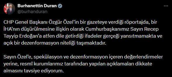 İletişim Başkanı Burhanettin Duran, sanal medya hesabından yaptığı açıklamada, "CHP Genel Başkanı Özgür Özel’in bir gazeteye verdiği röportajda, bir İHA’nın düşürülmesine ilişkin olarak Cumhurbaşkanımız Sayın Recep Tayyip Erdoğan’a atfen dile getirdiği ifadeler gerçeği yansıtmamakta ve açık bir dezenformasyon niteliği taşımaktadır. Sayın Özel’e, spekülasyon ve dezenformasyon içeren değerlendirmeler yerine, resmi kurumlarımız tarafından yapılan açıklamaları dikkate almasını tavsiye ediyorum" dedi.
