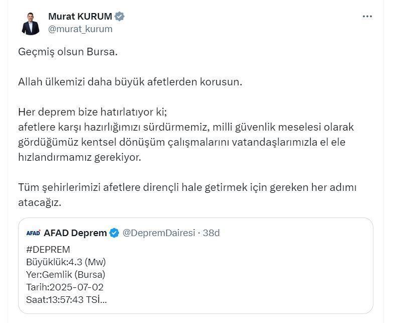 Çevre, Şehircilik ve İklim Değişikliği Bakanı Murat Kurum, depreme ilişkin sosyal medya hesabından açıklama yaptı. Bakan Kurum, "Geçmiş olsun Bursa. Allah ülkemizi daha büyük afetlerden korusun. Her deprem bize hatırlatıyor ki; afetlere karşı hazırlığımızı sürdürmemiz, milli güvenlik meselesi olarak gördüğümüz kentsel dönüşüm çalışmalarını vatandaşlarımızla el ele hızlandırmamız gerekiyor. Tüm şehirlerimizi afetlere dirençli hale getirmek için gereken her adımı atacağız" dedi. (DHA)