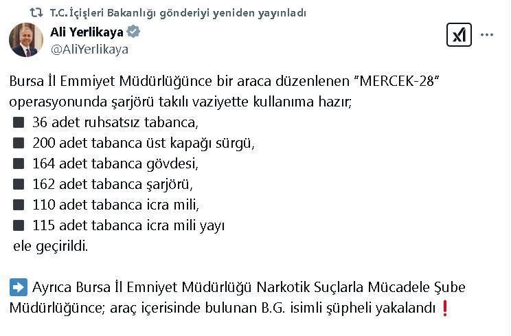 Bakan Yerlikaya, sosyal medya hesabından yaptığı açıklamada, "Bursa İl Emniyet Müdürlüğü'nce bir araca düzenlenen 'Mercek-28 Operasyonu'nda şarjörü takılı vaziyette kullanıma hazır; 36 adet ruhsatsız tabanca, 200 adet tabanca üst kapağı sürgü, 164 adet tabanca gövdesi, 162 adet tabanca şarjörü, 110 adet tabanca icra mili, 115 adet tabanca icra mili yayı ele geçirildi. Ayrıca Bursa İl Emniyet Müdürlüğü Narkotik Suçlarla Mücadele Şube Müdürlüğünce; araç içerisinde bulunan B.G. isimli şüpheli yakalandı" dedi.