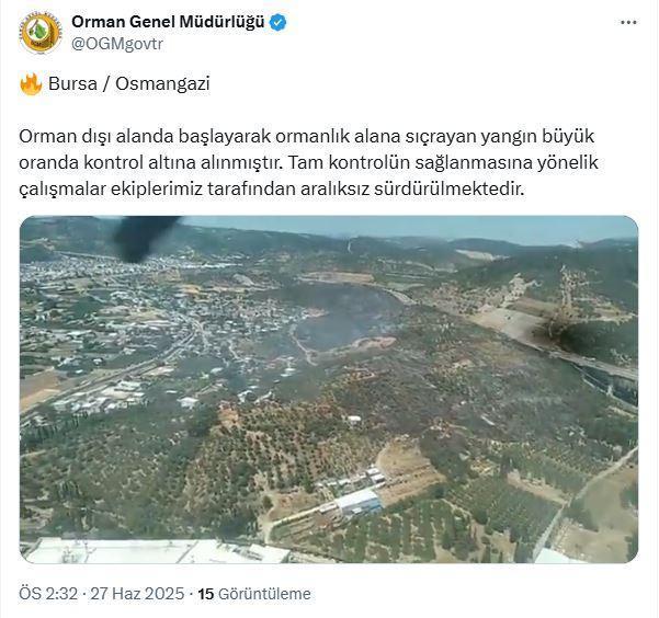 Orman Genel Müdürlüğü (OGM), Bursa'nın Osmangazi ilçesinde ormanlık alana sıçrayan yangının büyük oranda kontrol altına alındığını açıkladı. OGM'nin sosyal medya hesabından yapılan açıklamada, "Orman dışı alanda başlayarak ormanlık alana sıçrayan yangın, büyük oranda kontrol altına alınmıştır. Tam kontrolün sağlanmasına yönelik çalışmalar ekiplerimiz tarafından aralıksız sürdürülmektedir" denildi. (DHA)