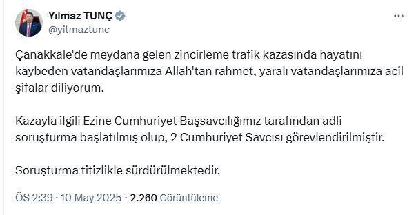 Adalet Bakanı Yılmaz Tunç, Çanakkale'de meydana gelen zincirleme trafik kazasına ilişkin sosyal medya hesabından açıklama yaptı. Bakan Tunç, "Çanakkale'de meydana gelen zincirleme trafik kazasında hayatını kaybeden vatandaşlarımıza Allah'tan rahmet, yaralı vatandaşlarımıza acil şifalar diliyorum. Kazayla ilgili Ezine Cumhuriyet Başsavcılığımız tarafından adli soruşturma başlatılmış olup, 2 Cumhuriyet savcısı görevlendirilmiştir. Soruşturma titizlikle sürdürülmektedir" dedi. (DHA)