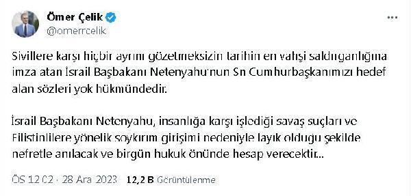 AK Parti'li Çelik, sosyal medya hesabından yaptığı açıklamada, İsrail Başbakanı Binyamin Netanyahu'nun Cumhurbaşkanı Recep Tayyip Erdoğan'ı hedef alan ifadelerine yanıt verdi. Çelik, "Sivillere karşı hiçbir ayrım gözetmeksizin tarihin en vahşi saldırganlığına imza atan İsrail Başbakanı Netanyahu'nun Sayın Cumhurbaşkanımızı hedef alan sözleri yok hükmündedir. İsrail Başbakanı Netanyahu, insanlığa karşı işlediği savaş suçları ve Filistinlilere yönelik soykırım girişimi nedeniyle layık olduğu şekilde nefretle anılacak ve bir gün hukuk önünde hesap verecektir" açıklamasında bulundu.