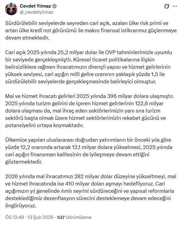 Cumhurbaşkanı Yardımcısı Cevdet Yılmaz, ödemeler dengesi istatistiklerine ilişkin sanal medya hesabından açıklama yaptı. Yılmaz, "Sürdürülebilir seviyelerde seyreden cari açık, azalan ülke risk primi ve artan ülke kredi not görünümü ile makro finansal istikrarımız güçlenmeye devam etmektedir. Cari açık 2025 yılında 25,2 milyar dolar ile OVP tahminlerimizle uyumlu bir seviyede gerçekleşmiştir. Küresel ticaret politikalarına ilişkin belirsizliklere rağmen ihracatımızın dirençli yapısı ve hizmet gelirlerinin yüksek seviyesi, cari açığın milli gelire oranının yaklaşık yüzde 1,5 ile sürdürülebilir seviyelerde gerçekleşmesinde belirleyici olmuştur. Mal ve hizmet ihracatı gelirleri 2025 yılında 396 milyar dolara ulaşmıştır. 2025 yılında turizm gelirini de içeren hizmet gelirlerinin 122,6 milyar dolara ulaşması da mal ihraç eden sektörlerimizin yanı sıra turizm sektörü başta olmak üzere hizmet sektörlerimizin rekabet gücünü ve potansiyelini ortaya koymaktadır. Ülkemize yapılan uluslararası doğrudan yatırımların bir önceki yıla göre yüzde 12,2 oranında artarak 13,1 milyar dolara yükselmesi, 2025 yılında cari açığın finansman kalitesinin de iyileşmeye devam ettiğini göstermektedir. 2026 yılında mal ihracatımızı 282 milyar dolar düzeyine yükseltmeyi, mal ve hizmet ihracatında ise 410 milyar doları aşmayı hedefliyoruz. Cari açığımızın yıl genelinde ılımlı seyrini sürdüreceğini ve yapısal reformlarla desteklediğimiz dezenflasyon sürecini desteklemeye devam edeceğini öngörüyoruz" dedi. (DHA)