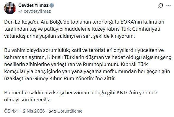 Cumhurbaşkanı Yardımcısı Yılmaz, sanal medya hesabından yaptığı açıklamada, "Dün Lefkoşa’da Ara Bölge’de toplanan terör örgütü EOKA’nın kalıntıları tarafından taş ve patlayıcı maddelerle Kuzey Kıbrıs Türk Cumhuriyeti vatandaşlarına yapılan saldırıyı en sert şekilde kınıyorum. Bu vahim olayda sorumluluk; katil ve teröristleri on yıllardır yücelten ve kahramanlaştıran, Kıbrıslı Türklerin düşman ve hedef olduğu algısını genç nesillerin zihinlerine yerleştiren ve Rum toplumunu Kıbrıslı Türk komşularıyla barış içinde yan yana yaşama mefhumundan her geçen gün uzaklaştıran Güney Kıbrıs Rum Yönetimi’ne aittir. Bu menfur saldırılara karşı her zaman olduğu gibi KKTC’nin yanında olmayı sürdüreceğiz" ifadelerini kullandı. (DHA)