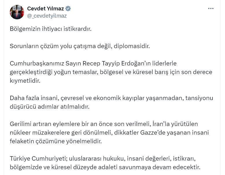 Cevdet Yılmaz, sosyal medya hesabından yaptığı açıklamada, "Bölgemizin ihtiyacı istikrardır. Sorunların çözüm yolu çatışma değil, diplomasidir. Cumhurbaşkanımız Sayın Recep Tayyip Erdoğan’ın liderlerle gerçekleştirdiği yoğun temaslar, bölgesel ve küresel barış için son derece kıymetlidir. Daha fazla insani, çevresel ve ekonomik kayıplar yaşanmadan, tansiyonu düşürücü adımlar atılmalıdır. Gerilimi artıran eylemlere bir an önce son verilmeli, İran’la yürütülen nükleer müzakerelere geri dönülmeli, dikkatler Gazze’de yaşanan insani felaketin çözümüne yönelmelidir. Türkiye Cumhuriyeti; uluslararası hukuku, insani değerleri, istikrarı, bölgemizde ve küresel düzeyde adaleti savunmaya devam edecektir" ifadelerini kullandı. (DHA)