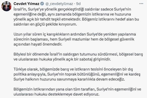 Cumhurbaşkanı Yardımcısı Yılmaz, İsrail'in, Suriye'ye yönelik gerçekleştirdiği saldırılara ilişkin sosyal medya hesabından açıklama yaptı. Yılmaz, “İsrail’in, Suriye’ye yönelik gerçekleştirdiği saldırılar sadece Suriye’nin egemenliğine değil, aynı zamanda bölgemizin istikrarına ve huzuruna yönelik açık bir tehdit teşkil etmektedir. Bölgemiz istikrarını hedef alan bu saldırıları en güçlü şekilde kınıyorum. Uzun yıllar süren iç karışıklıkların ardından Suriye’de yeniden yapılanma sürecinin başlaması hem Suriyeli mazlumlar hem de bölgesel güvenlik açısından hayati önemdedir. Böylesi bir dönemde İsrail’in saldırgan tutumunu sürdürmesi, bölgesel barış ve uluslararası hukuka yönelik açık bir sabotaj girişimidir" dedi.