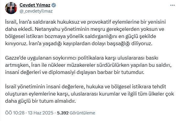 Cumhurbaşkanı Yardımcısı Cevdet Yılmaz, sosyal medya hesabından yaptığı açıklamada, "İsrail, İran'a saldırarak hukuksuz ve provokatif eylemlerine bir yenisini daha ekledi. Netanyahu yönetiminin meşru gerekçelerden yoksun ve bölgesel istikrarı bozmaya yönelik saldırganlığını en güçlü şekilde kınıyoruz. İran'a yaşadığı kayıplardan dolayı başsağlığı diliyoruz. Gazze'de uygulanan soykırımcı politikalara karşı uluslararası baskı artmışken, İran ile nükleer müzakereler sürdürülürken yapılan bu saldırı, insani değerleri ve diplomasiyi dışlayan barbar bir tutumdur. İsrail yönetiminin insani değerlere, hukuka ve bölgesel istikrara tehdit oluşturan eylemlerine karşı, uluslararası kurumlar ve ilgili tüm ülkeler çok daha güçlü bir tutum almalıdır" dedi. (DHA)