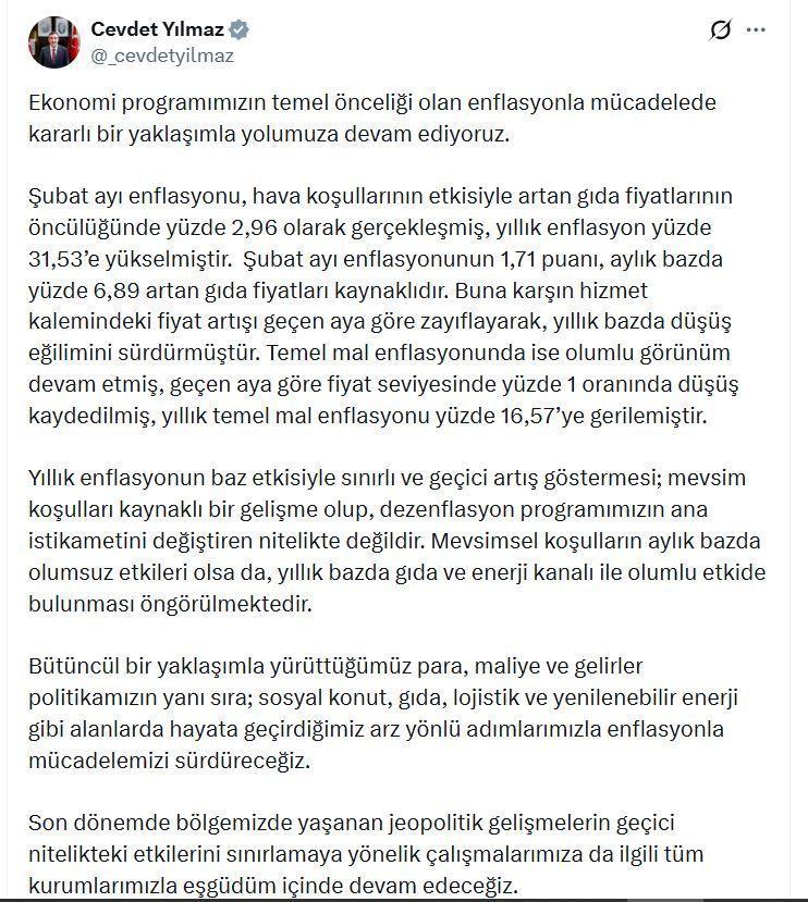 Cevdet Yılmaz, şubat ayı enflasyon verilerine ilişkin sanal medya hesabından açıklama yaptı. Yılmaz, "Ekonomi programımızın temel önceliği olan enflasyonla mücadelede kararlı bir yaklaşımla yolumuza devam ediyoruz. Şubat ayı enflasyonu, hava koşullarının etkisiyle artan gıda fiyatlarının öncülüğünde yüzde 2,96 olarak gerçekleşmiş, yıllık enflasyon yüzde 31,53'e yükselmiştir. Şubat ayı enflasyonunun 1,71 puanı, aylık bazda yüzde 6,89 artan gıda fiyatları kaynaklıdır. Buna karşın hizmet kalemindeki fiyat artışı geçen aya göre zayıflayarak, yıllık bazda düşüş eğilimini sürdürmüştür. Temel mal enflasyonunda ise olumlu görünüm devam etmiş, geçen aya göre fiyat seviyesinde yüzde 1 oranında düşüş kaydedilmiş, yıllık temel mal enflasyonu yüzde 16,57'ye gerilemiştir" dedi.