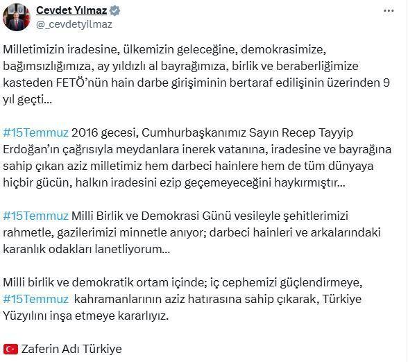 Cumhurbaşkanı Yardımcısı Cevdet Yılmaz, sosyal medya hesabından yaptığı açıklamada, "Milletimizin iradesine, ülkemizin geleceğine, demokrasimize, bağımsızlığımıza, ay yıldızlı al bayrağımıza, birlik ve beraberliğimize kasteden FETÖ’nün hain darbe girişiminin bertaraf edilişinin üzerinden 9 yıl geçti. 15 Temmuz 2016 gecesi, Cumhurbaşkanımız Sayın Recep Tayyip Erdoğan’ın çağrısıyla meydanlara inerek vatanına, iradesine ve bayrağına sahip çıkan aziz milletimiz hem darbeci hainlere hem de tüm dünyaya hiçbir gücün, halkın iradesini ezip geçemeyeceğini haykırmıştır. 15 Temmuz Milli Birlik ve Demokrasi Günü vesileyle şehitlerimizi rahmetle, gazilerimizi minnetle anıyor; darbeci hainleri ve arkalarındaki karanlık odakları lanetliyorum. Milli birlik ve demokratik ortam içinde; iç cephemizi güçlendirmeye, 15 Temmuz kahramanlarının aziz hatırasına sahip çıkarak, Türkiye Yüzyılını inşa etmeye kararlıyız. Zaferin Adı Türkiye" dedi. (DHA)
