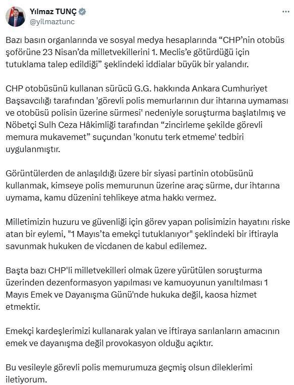 Adalet Bakanı Yılmaz Tunç, sosyal medya hesabından yaptığı açıklamada, “Bazı basın organlarında ve sosyal medya hesaplarında 'CHP’nin otobüs şoförüne 23 Nisan’da milletvekillerini 1. Meclis’e götürdüğü için tutuklama talep edildiği' şeklindeki iddialar büyük bir yalandır. CHP otobüsünü kullanan sürücü G.G. hakkında Ankara Cumhuriyet Başsavcılığı tarafından 'görevli polis memurlarının dur ihtarına uymaması ve otobüsü polisin üzerine sürmesi' nedeniyle soruşturma başlatılmış ve Nöbetçi Sulh Ceza Hâkimliği tarafından ‘zincirleme şekilde görevli memura mukavemet’ suçundan 'konutu terk etmeme' tedbiri uygulanmıştır. Görüntülerden de anlaşıldığı üzere bir siyasi partinin otobüsünü kullanmak, kimseye polis memurunun üzerine araç sürme, dur ihtarına uymama, kamu düzenini tehlikeye atma hakkı vermez" dedi.