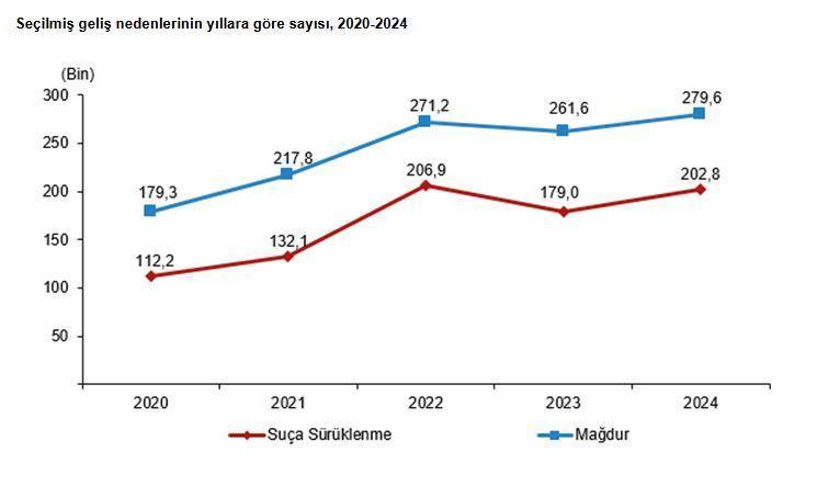 Türkiye İstatistik Kurumu (TÜİK), 2024 yılına ilişkin güvenlik birimine gelen veya getirilen çocuk istatistiklerini açıkladı. Buna göre; güvenlik birimlerine gelen veya getirilen çocukların karıştığı olay sayısı 2024 yılında, 2023 yılına göre yüzde 9,8 oranında artarak 612 bin 651 oldu. Bu olaylarda çocukların 279 bin 620'si mağdur olarak, 202 bin 785'i suça sürüklenme sebebiyle, 96 bin 438'i bilgisine başvurma amacıyla, 18 bin 561'i kayıp olması sebebiyle, 8 bin 729'u kabahat işlediği iddiasıyla, 6 bin 518'i ise bu nedenlerin dışında kalan diğer nedenlerden dolayı güvenlik birimlerine geldi veya getirildi.