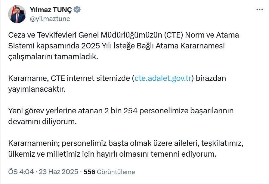 Adalet Bakanı Yılmaz Tunç, sosyal medya hesabından yaptığı açıklamada, "Ceza ve Tevkifevleri Genel Müdürlüğümüzün Norm ve Atama Sistemi kapsamında, 2025 Yılı İsteğe Bağlı Atama Kararnamesi çalışmalarını tamamladık. Kararname, CTE internet sitemizde (http://cte.adalet.gov.tr) birazdan yayımlanacaktır. Yeni görev yerlerine atanan 2 bin 254 personelimize başarılarının devamını diliyorum. Kararnamenin; personelimiz başta olmak üzere aileleri, teşkilatımız, ülkemiz ve milletimiz için hayırlı olmasını temenni ediyorum" ifadelerini kullandı. (DHA)