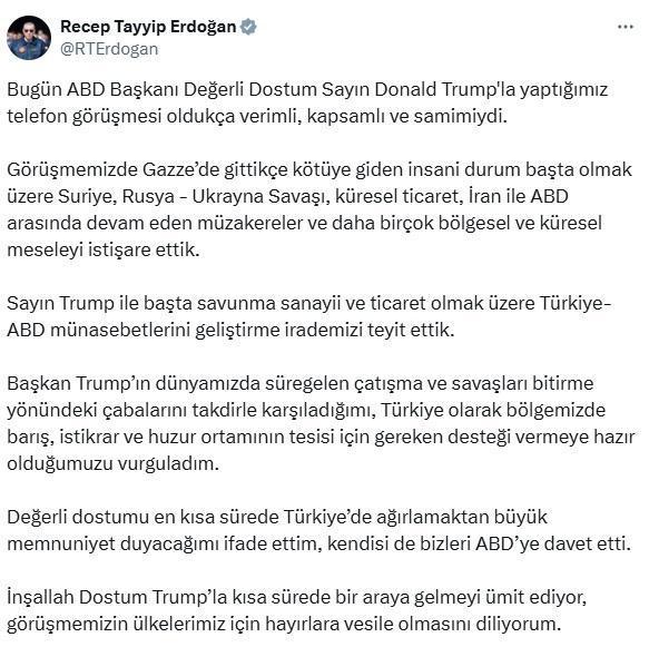 Cumhurbaşkanı Recep Tayyip Erdoğan, ABD Başkanı Donald Trump ile yaptığı telefon görüşmesine ilişkin sosyal medya hesabından paylaşım yaptı. Erdoğan, "Bugün ABD Başkanı değerli dostum Sayın Donald Trump'la yaptığımız telefon görüşmesi oldukça verimli, kapsamlı ve samimiydi. Görüşmemizde Gazze'de gittikçe kötüye giden insani durum başta olmak üzere Suriye, Rusya - Ukrayna Savaşı, küresel ticaret, İran ile ABD arasında devam eden müzakereler ve daha birçok bölgesel ve küresel meseleyi istişare ettik. Sayın Trump ile başta savunma sanayii ve ticaret olmak üzere Türkiye-ABD münasebetlerini geliştirme irademizi teyit ettik. Başkan Trump’ın dünyamızda süregelen çatışma ve savaşları bitirme yönündeki çabalarını takdirle karşıladığımı, Türkiye olarak bölgemizde barış, istikrar ve huzur ortamının tesisi için gereken desteği vermeye hazır olduğumuzu vurguladım. Değerli dostumu en kısa sürede Türkiye’de ağırlamaktan büyük memnuniyet duyacağımı ifade ettim, kendisi de bizleri ABD’ye davet etti. İnşallah Dostum Trump'la kısa sürede bir araya gelmeyi ümit ediyor, görüşmemizin ülkelerimiz için hayırlara vesile olmasını diliyorum" ifadelerine yer verdi. (DHA)