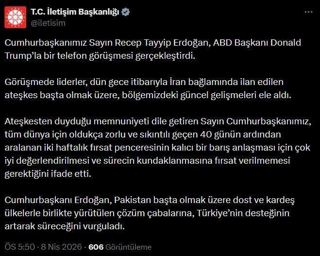 İletişim Başkanlığı'ndan yapılan yazılı açıklamada, "Cumhurbaşkanımız Sayın Recep Tayyip Erdoğan, ABD Başkanı Donald Trump’la bir telefon görüşmesi gerçekleştirdi. Görüşmede liderler, dün gece itibarıyla İran bağlamında ilan edilen ateşkes başta olmak üzere, bölgemizdeki güncel gelişmeleri ele aldı. Ateşkesten duyduğu memnuniyeti dile getiren Sayın Cumhurbaşkanımız, tüm dünya için oldukça zorlu ve sıkıntılı geçen 40 günün ardından aralanan 2 haftalık fırsat penceresinin kalıcı bir barış anlaşması için çok iyi değerlendirilmesi ve sürecin kundaklanmasına fırsat verilmemesi gerektiğini ifade etti. Cumhurbaşkanı Erdoğan, Pakistan başta olmak üzere dost ve kardeş ülkelerle birlikte yürütülen çözüm çabalarına, Türkiye’nin desteğinin artarak süreceğini vurguladı" ifadelerini kullandı. (DHA)