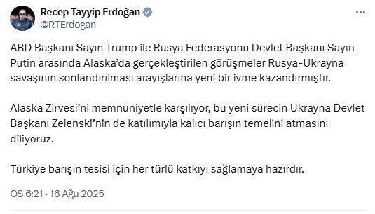 Cumhurbaşkanı Recep Tayyip Erdoğan, sosyal medya hesabından yaptığı açıklamada, "ABD Başkanı Sayın Trump ile Rusya Federasyonu Devlet Başkanı Sayın Putin arasında Alaska'da gerçekleştirilen görüşmeler, Rusya-Ukrayna savaşının sonlandırılması arayışlarına yeni bir ivme kazandırmıştır. Alaska Zirvesi'ni memnuniyetle karşılıyor, bu yeni sürecin Ukrayna Devlet Başkanı Zelenski'nin de katılımıyla kalıcı barışın temelini atmasını diliyoruz. Türkiye barışın tesisi için her türlü katkıyı sağlamaya hazırdır" ifadelerini kullandı. (DHA)