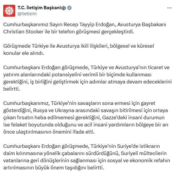 ANKARA, (DHA)- CUMHURBAŞKANI Recep Tayyip Erdoğan, Avusturya Başbakanı Christian Stocker ile bir telefonda görüştü.