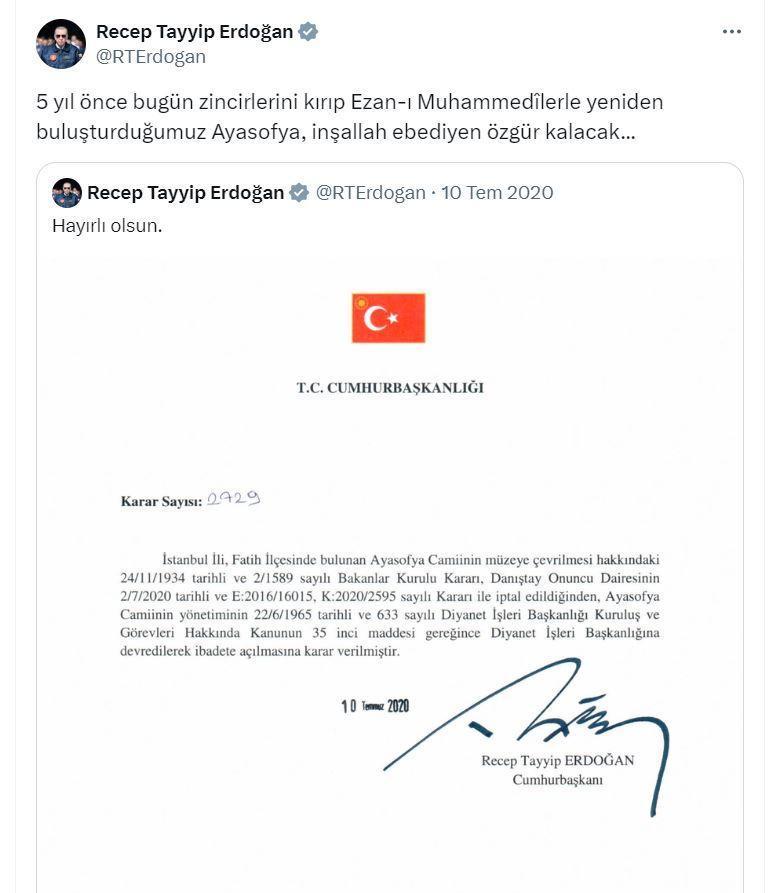 Cumhurbaşkanı Erdoğan, Ayasofya'nın yeniden cami olarak ibadete açılması için 5 yıl önce yayımlanan Cumhurbaşkanlığı Kararnamesi'ni sosyal medya hesabından paylaşarak, "5 yıl önce bugün zincirlerini kırıp Ezan-ı Muhammedilerle yeniden buluşturduğumuz Ayasofya, inşallah ebediyen özgür kalacak" ifadelerini kullandı. (DHA)