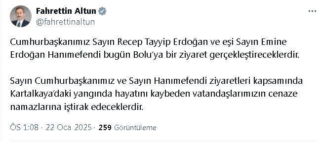 İletişim Başkanı Fahrettin Altun, sosyal medya hesabından yaptığı açıklamada, "Cumhurbaşkanımız Sayın Recep Tayyip Erdoğan ve eşi Sayın Emine Erdoğan Hanımefendi, bugün Bolu'ya bir ziyaret gerçekleştireceklerdir. Sayın Cumhurbaşkanımız ve Sayın Hanımefendi, ziyaretleri kapsamında Kartalkaya'daki yangında hayatını kaybeden vatandaşlarımızın cenaze namazlarına iştirak edeceklerdir" dedi. (DHA)