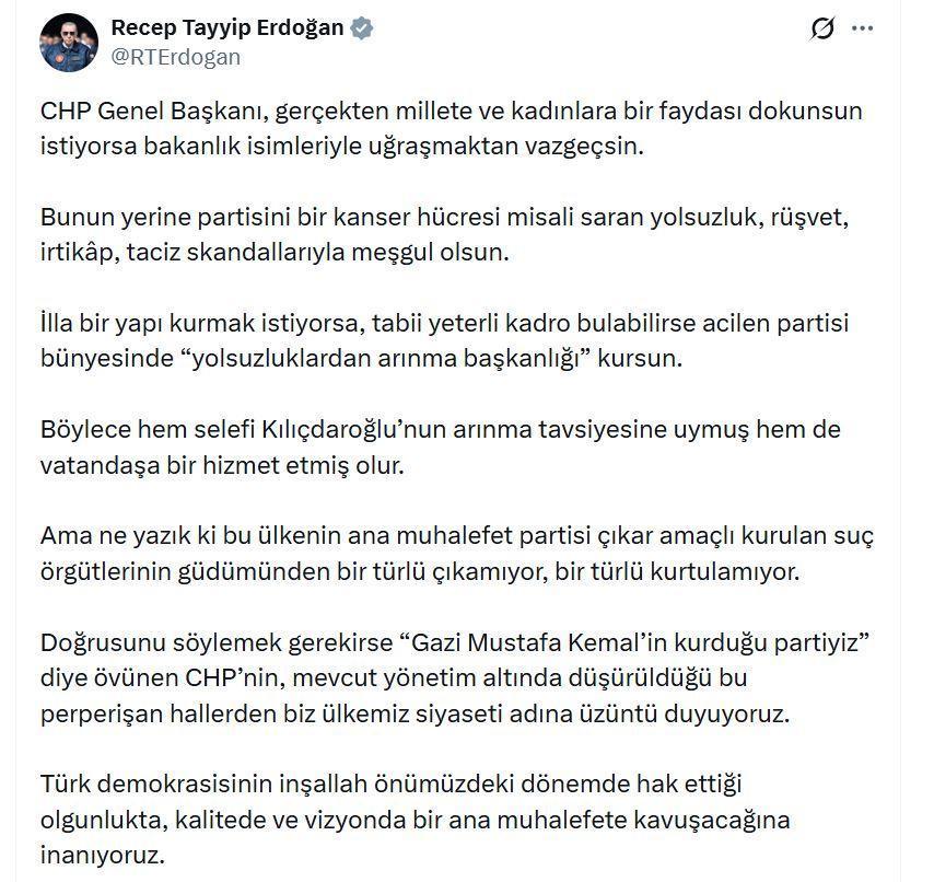 Cumhurbaşkanı Erdoğan, sanal medya hesabından yaptığı açıklamada, "CHP Genel Başkanı, gerçekten millete ve kadınlara bir faydası dokunsun istiyorsa, bakanlık isimleriyle uğraşmaktan vazgeçsin. Bunun yerine partisini bir kanser hücresi misali saran yolsuzluk, rüşvet, irtikap, taciz skandallarıyla meşgul olsun. İlla bir yapı kurmak istiyorsa, tabii yeterli kadro bulabilirse acilen partisi bünyesinde 'yolsuzluklardan arınma başkanlığı' kursun. Böylece hem selefi Kılıçdaroğlu'nun arınma tavsiyesine uymuş hem de vatandaşa bir hizmet etmiş olur. Ama ne yazık ki bu ülkenin ana muhalefet partisi çıkar amaçlı kurulan suç örgütlerinin güdümünden bir türlü çıkamıyor, bir türlü kurtulamıyor. Doğrusunu söylemek gerekirse 'Gazi Mustafa Kemal'in kurduğu partiyiz' diye övünen CHP'nin mevcut yönetim altında düşürüldüğü bu perperişan hallerden biz ülkemiz siyaseti adına üzüntü duyuyoruz. Türk demokrasisinin inşallah önümüzdeki dönemde hak ettiği olgunlukta, kalitede ve vizyonda bir ana muhalefete kavuşacağına inanıyoruz" ifadelerini kullandı. (DHA)
