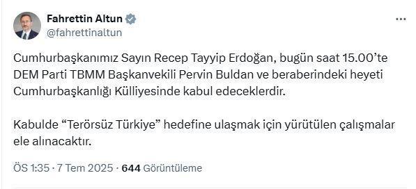 İletişim Başkanı Fahrettin Altun, sosyal medya hesabından yaptığı açıklamada, "Cumhurbaşkanımız Sayın Recep Tayyip Erdoğan, bugün saat 15.00'te DEM Parti TBMM Başkan Vekili Pervin Buldan ve beraberindeki heyeti, Cumhurbaşkanlığı Külliyesi'nde kabul edeceklerdir. Kabulde, 'Terörsüz Türkiye' hedefine ulaşmak için yürütülen çalışmalar ele alınacaktır" ifadelerini kullandı. (DHA)