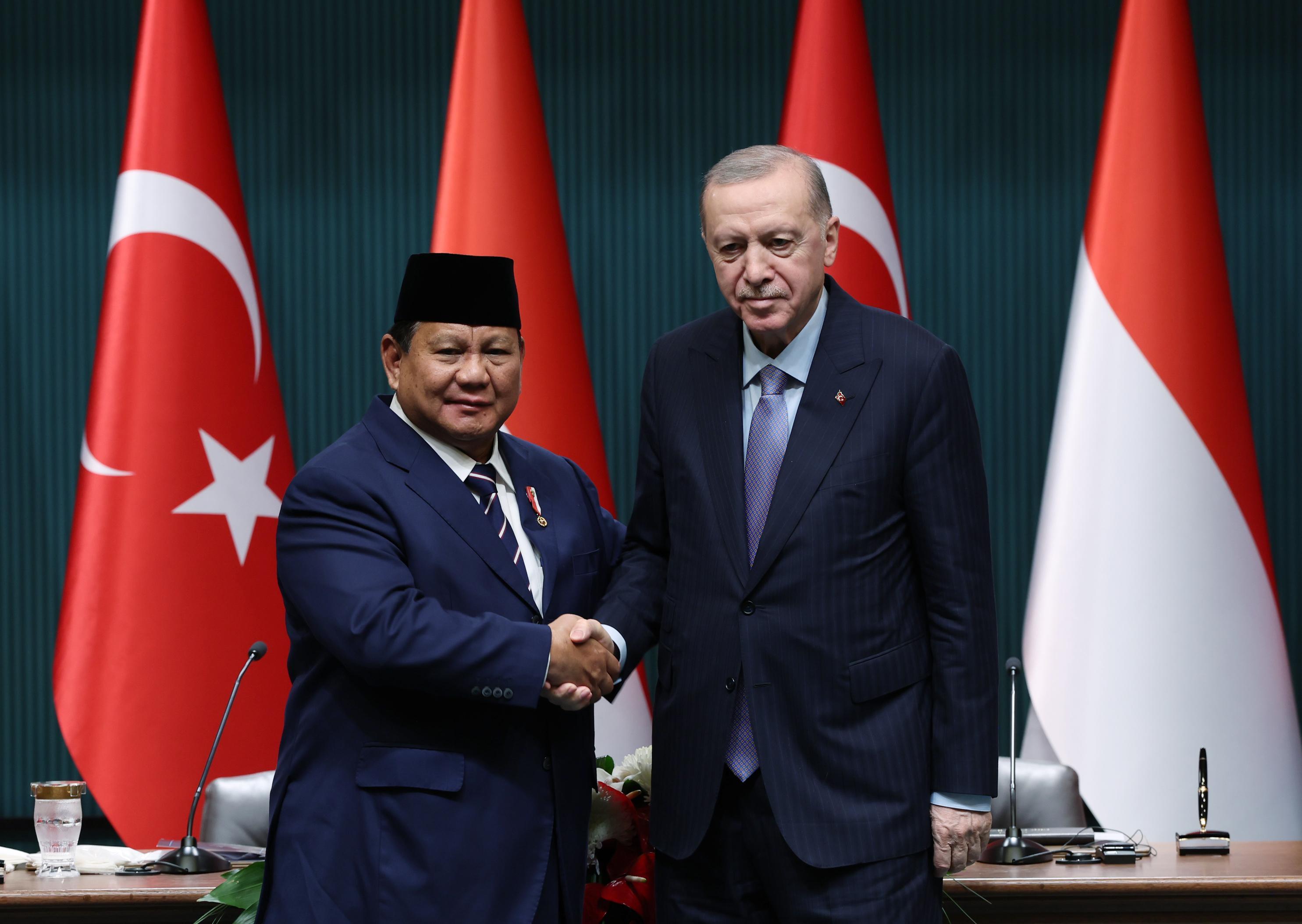 Cumhurbaşkanı Recep Tayyip Erdoğan, Cumhurbaşkanlığı Külliyesi'nde Endonezya Cumhurbaşkanı Prabowo Subianto ile heyetler arası görüşme ve iki ülke arasındaki anlaşmaların imza töreninin ardından ortak basın toplantısı düzenledi. Erdoğan, Endonezya ile bu sene diplomatik ilişkilerin tesisinde 75. yıl dönümü olduğunu ifade ederek, "Tarihi bağlarımız bundan 400 yıl öncesine kadar dayanıyor. Az önce kültür, afet ve acil durum yönetimi ve iletişim alanlarında belgeleri imzaladık. Ticaret hacmimizi karşılıklı fayda temelinde ve dengeli şekilde 10 milyar dolar hedefine yükseltmek için atılabilecek adımları değerlendirdik. Savunma sanayinden müteahhitliğe, sağlık ve enerjiden gıda sektörüne kadar iş birliğimizde yeni açılımlar yapma hususunda mutabık kaldık. Savunma sanayi bağlamında ortak üretim dahil olmak üzere mevcut projelerimizi ve yeni iş birliği imkanlarını değerlendirdik" dedi.