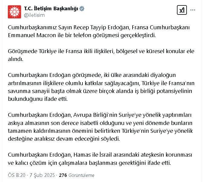 İletişim Başkanlığı sosyal medya hesabından paylaşım yaparak, Cumhurbaşkanı Recep Tayyip Erdoğan'ın Fransa Cumhurbaşkanı Emmanuel Macron ile bir telefon görüşmesi gerçekleştirdiğini açıkladı. Görüşmede Türkiye ile Fransa ikili ilişkileri, bölgesel ve küresel konular ele alındı. Cumhurbaşkanı Erdoğan görüşmede, iki ülke arasındaki diyaloğun artırılmasının ilişkilere olumlu katkılar sağlayacağını, Türkiye ile Fransa’nın savunma sanayii başta olmak üzere birçok alanda iş birliği potansiyelinin bulunduğunu ifade etti. Cumhurbaşkanı Erdoğan, Avrupa Birliği’nin Suriye’ye yönelik yaptırımları askıya almasının son derece isabetli olduğunu ve yeni dönemde bunların tamamen kaldırılmasının önemini belirtirken, Türkiye’nin Suriye’ye yönelik desteğine aralıksız devam edeceğini söyledi. Cumhurbaşkanı Erdoğan, Hamas ile İsrail arasındaki ateşkesin korunması ve kalıcı çözüm için çalışmalara başlanması gerektiğini ifade etti. (DHA)