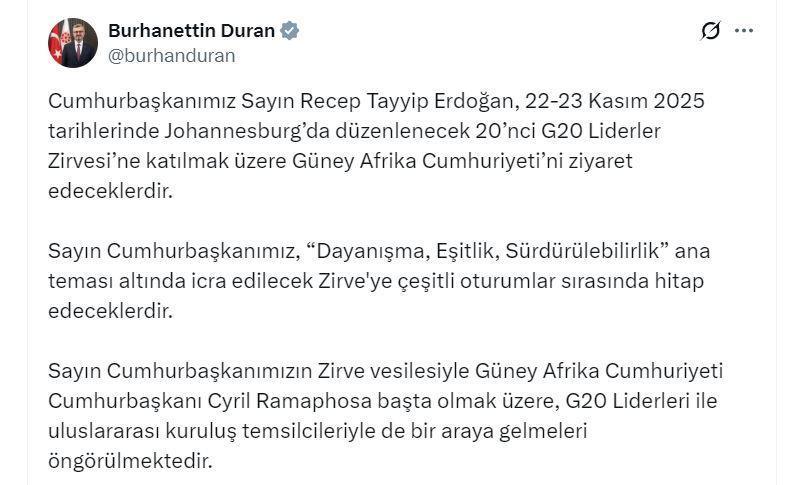 İletişim Başkanı Burhanettin Duran, sosyal medya hesabından yaptığı açıklamada, "Cumhurbaşkanımız Sayın Recep Tayyip Erdoğan, 22-23 Kasım 2025 tarihlerinde Johannesburg'da düzenlenecek 20'nci G20 Liderler Zirvesi'ne katılmak üzere Güney Afrika Cumhuriyeti'ni ziyaret edeceklerdir. Sayın Cumhurbaşkanımız, 'Dayanışma, Eşitlik, Sürdürülebilirlik' ana teması altında icra edilecek Zirve'ye çeşitli oturumlar sırasında hitap edeceklerdir. Sayın Cumhurbaşkanımızın Zirve vesilesiyle Güney Afrika Cumhuriyeti Cumhurbaşkanı Cyril Ramaphosa başta olmak üzere, G20 Liderleri ile uluslararası kuruluş temsilcileriyle de bir araya gelmeleri öngörülmektedir" dedi. (DHA)