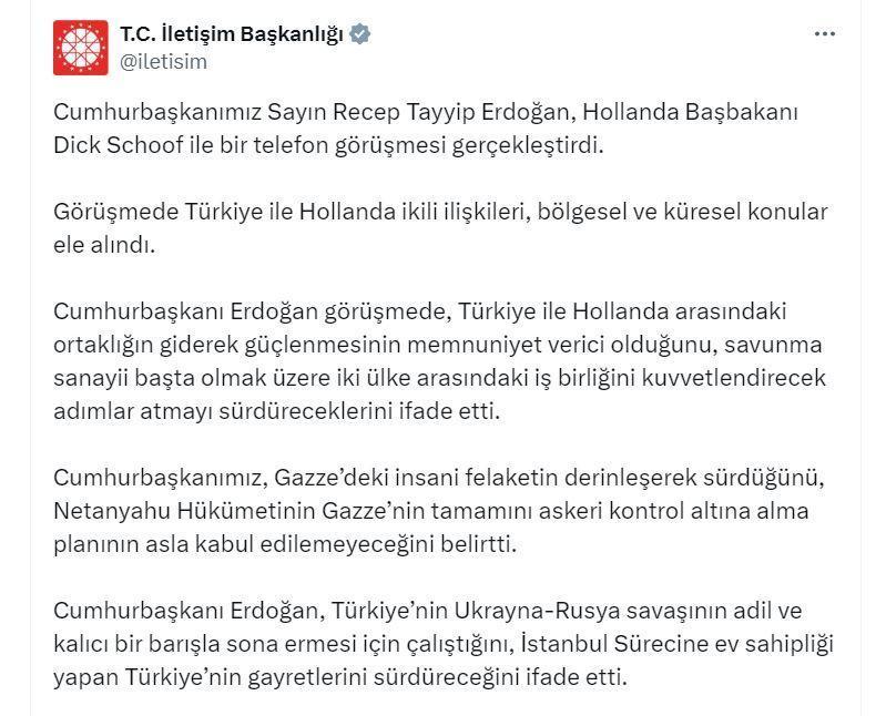 İletişim Başkanlığı'nın sosyal medya hesabından yapılan yazılı açıklamada, "Cumhurbaşkanımız Sayın Recep Tayyip Erdoğan, Hollanda Başbakanı Dick Schoof ile bir telefon görüşmesi gerçekleştirdi. Görüşmede, Türkiye ile Hollanda ikili ilişkileri, bölgesel ve küresel konular ele alındı. Cumhurbaşkanı Erdoğan görüşmede, Türkiye ile Hollanda arasındaki ortaklığın giderek güçlenmesinin memnuniyet verici olduğunu, savunma sanayii başta olmak üzere iki ülke arasındaki iş birliğini kuvvetlendirecek adımlar atmayı sürdüreceklerini ifade etti. Cumhurbaşkanımız, Gazze’deki insani felaketin derinleşerek sürdüğünü, Netanyahu Hükümetinin Gazze’nin tamamını askeri kontrol altına alma planının asla kabul edilemeyeceğini belirtti. Cumhurbaşkanı Erdoğan, Türkiye’nin Ukrayna-Rusya savaşının adil ve kalıcı bir barışla sona ermesi için çalıştığını, İstanbul Sürecine ev sahipliği yapan Türkiye’nin gayretlerini sürdüreceğini ifade etti" denildi. (DHA)