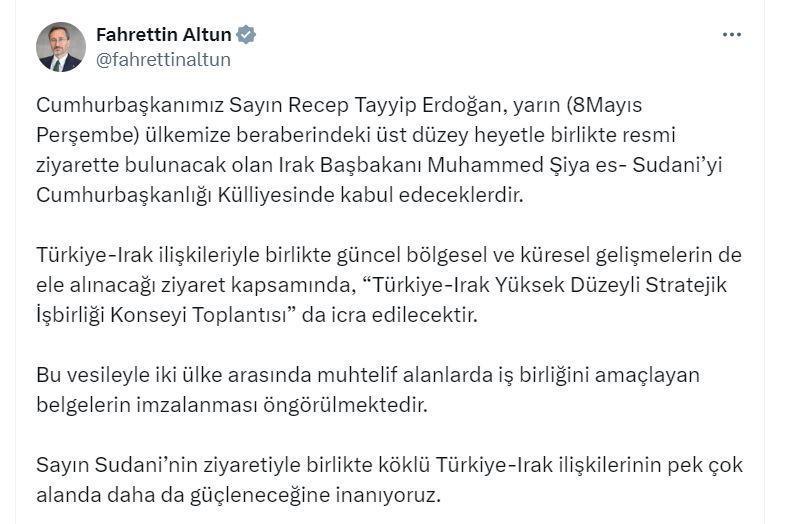 İletişim Başkanı Fahrettin Altun, ziyarete ilişkin sosyal medya hesabından açıklama yaptı. Altun, "Cumhurbaşkanımız Sayın Recep Tayyip Erdoğan, yarın ülkemize beraberindeki üst düzey heyetle birlikte resmi ziyarette bulunacak olan Irak Başbakanı Muhammed Şiya es- Sudani'yi Cumhurbaşkanlığı Külliyesinde kabul edeceklerdir. Türkiye-Irak ilişkileriyle birlikte güncel bölgesel ve küresel gelişmelerin de ele alınacağı ziyaret kapsamında, 'Türkiye-Irak Yüksek Düzeyli Stratejik İşbirliği Konseyi Toplantısı' da icra edilecektir. Bu vesileyle iki ülke arasında muhtelif alanlarda iş birliğini amaçlayan belgelerin imzalanması öngörülmektedir. Sayın Sudani'nin ziyaretiyle birlikte köklü Türkiye-Irak ilişkilerinin pek çok alanda daha da güçleneceğine inanıyoruz" dedi. (DHA)