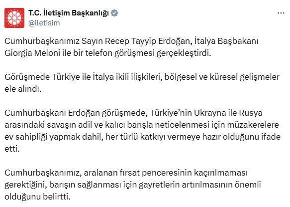 ANKARA, (DHA)- CUMHURBAŞKANI Recep Tayyip Erdoğan, İtalya Başbakanı Giorgia Meloni ile telefonda görüştü.