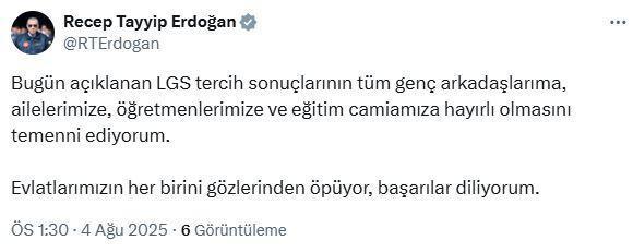 ANKARA, (DHA)- CUMHURBAŞKANI Recep Tayyip Erdoğan, Liselere Geçiş Sistemi (LGS) tercih sonuçlarının eğitim camiasına hayırlı olması temennisinde bulundu.