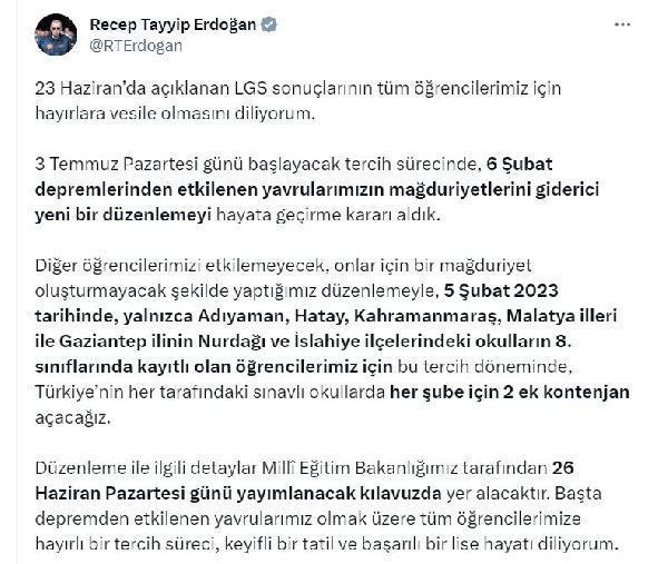 Cumhurbaşkanı Erdoğan, Twitter hesabından yaptığı açıklamada, 23 Haziran'da açıklanan Liselere Geçiş Sistemi (LGS) sonuçlarının tüm öğrenciler için hayırlara vesile olmasını dileyerek, "3 Temmuz Pazartesi günü başlayacak tercih sürecinde, 6 Şubat depremlerinden etkilenen yavrularımızın mağduriyetlerini giderici yeni bir düzenlemeyi hayata geçirme kararı aldık. Diğer öğrencilerimizi etkilemeyecek, onlar için bir mağduriyet oluşturmayacak şekilde yaptığımız düzenlemeyle, 5 Şubat 2023 tarihinde, yalnızca Adıyaman, Hatay, Kahramanmaraş, Malatya illeri ile Gaziantep ilinin Nurdağı ve İslahiye ilçelerindeki okulların 8'inci sınıflarında kayıtlı olan öğrencilerimiz için bu tercih döneminde, Türkiye'nin her tarafındaki sınavlı okullarda her şube için 2 ek kontenjan açacağız" ifadelerini kullandı. Erdoğan, düzenleme ile ilgili detayların Mili Eğitim Bakanlığı tarafından 26 Haziran'da yayımlanacak kılavuzda yer alacağını belirterek, başta depremden etkilenen öğrenciler olmak üzere tüm öğrencilere hayırlı bir tercih süreci, keyifli bir tatil ve başarılı bir lise hayatı diledi. (DHA)