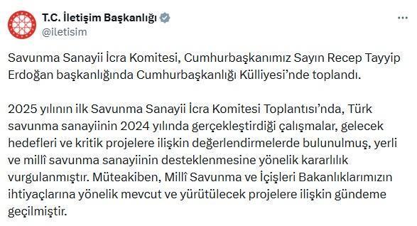 Savunma Sanayii İcra Komitesi Toplantısı’nda ele alınan konular hakkında Cumhurbaşkanlığı İletişim Başkanlığı tarafından sosyal medya hesabı üzerinden açıklama yapıldı. Açıklamada, 2025 yılının ilk Savunma Sanayii İcra Komitesi Toplantısı’nda, Türk savunma sanayiinin 2024 yılında gerçekleştirdiği çalışmalar, gelecek hedefleri ve kritik projelere ilişkin değerlendirmelerde bulunulduğu, yerli ve milli savunma sanayiinin desteklenmesine yönelik kararlılığın vurgulandığı kaydedildi.