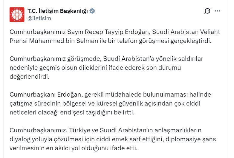 İletişim Başkanlığı'nın sanal medya hesabından yapılan açıklamada, "Cumhurbaşkanımız Sayın Recep Tayyip Erdoğan, Suudi Arabistan Veliaht Prensi Muhammed bin Selman ile bir telefon görüşmesi gerçekleştirdi. Cumhurbaşkanımız görüşmede, Suudi Arabistan'a yönelik saldırılar nedeniyle geçmiş olsun dileklerini ifade ederek son durumu değerlendirdi. Cumhurbaşkanı Erdoğan, gerekli müdahalede bulunulmaması halinde çatışma sürecinin bölgesel ve küresel güvenlik açısından çok ciddi neticeleri olacağı endişesi taşıdığını belirtti. Cumhurbaşkanımız, Türkiye ve Suudi Arabistan'ın anlaşmazlıkların diyalog yoluyla çözülmesi için ciddi emek sarf ettiğini, diplomasiye şans verilmesinin en akılcı yol olduğunu ifade etti" denildi. (DHA)
