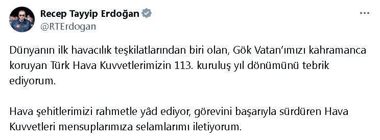 ANKARA, (DHA)- CUMHURBAŞKANI Recep Tayyip Erdoğan, Hava Kuvvetleri Komutanlığı'nın 113'üncü kuruluş yıl dönümünü tebrik etti.