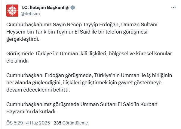 İletişim Başkanlığı'ndan yapılan açıklamaya göre; Cumhurbaşkanı Recep Tayyip Erdoğan, Umman Sultanı Heysem bin Tarık bin Teymur El Said ile bir telefon görüşmesi gerçekleştirdi. Görüşmede Türkiye ile Umman ikili ilişkileri, bölgesel ve küresel konular ele alındı. Cumhurbaşkanı Erdoğan görüşmede, Türkiye'nin Umman ile iş birliğinin her alanda güçlendiğini, ilişkileri geliştirmek için gayret göstermeye devam edeceklerini belirtti. Erdoğan, Umman Sultanı El Said'in Kurban Bayramı'nı da kutladı. (DHA)